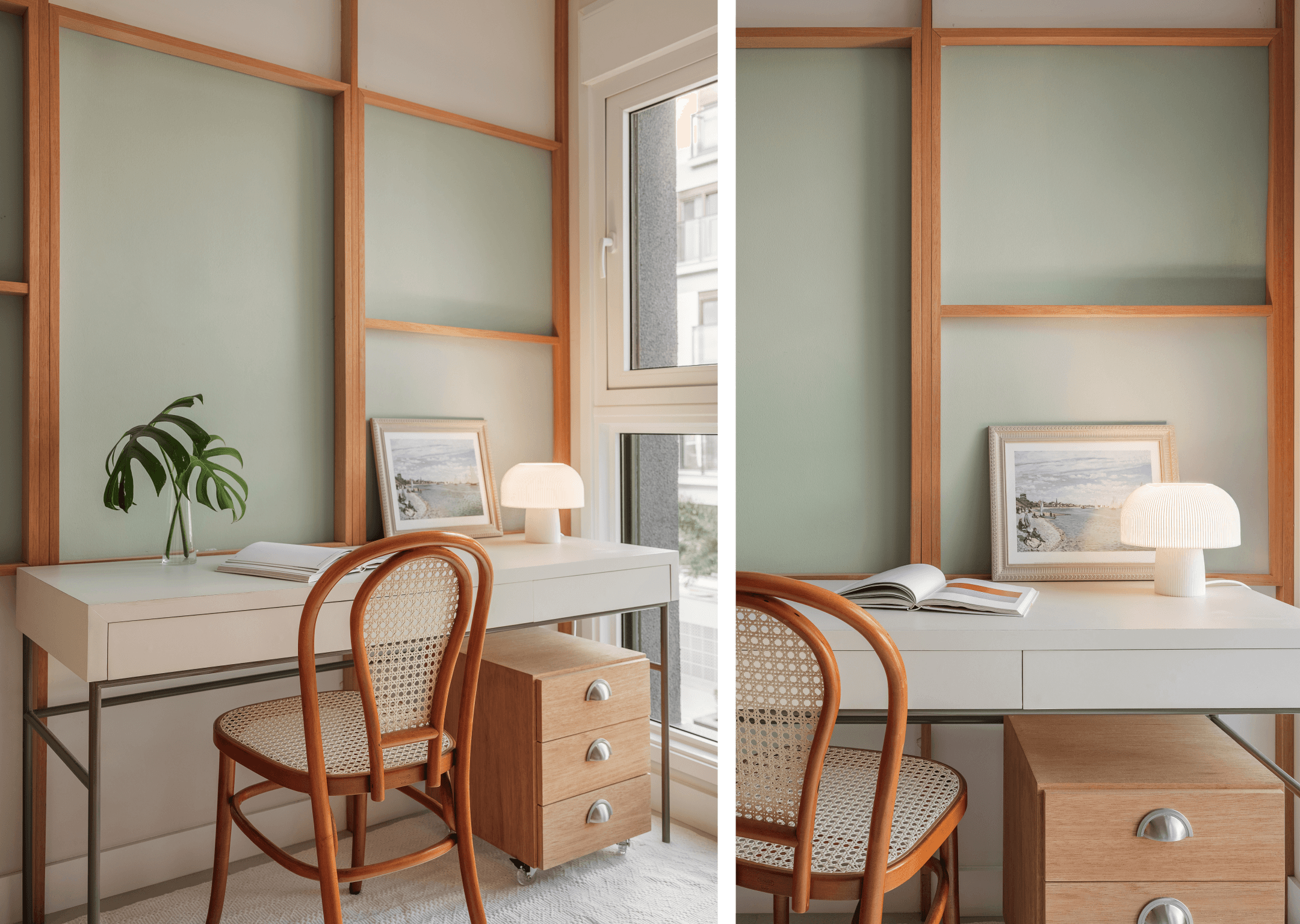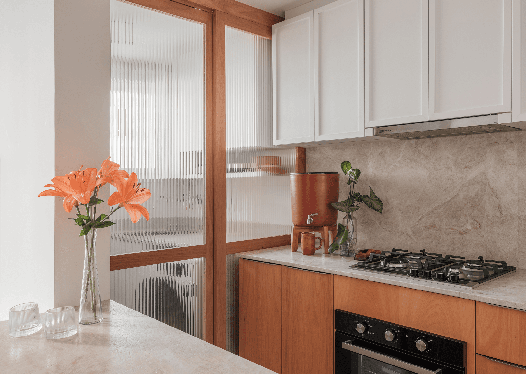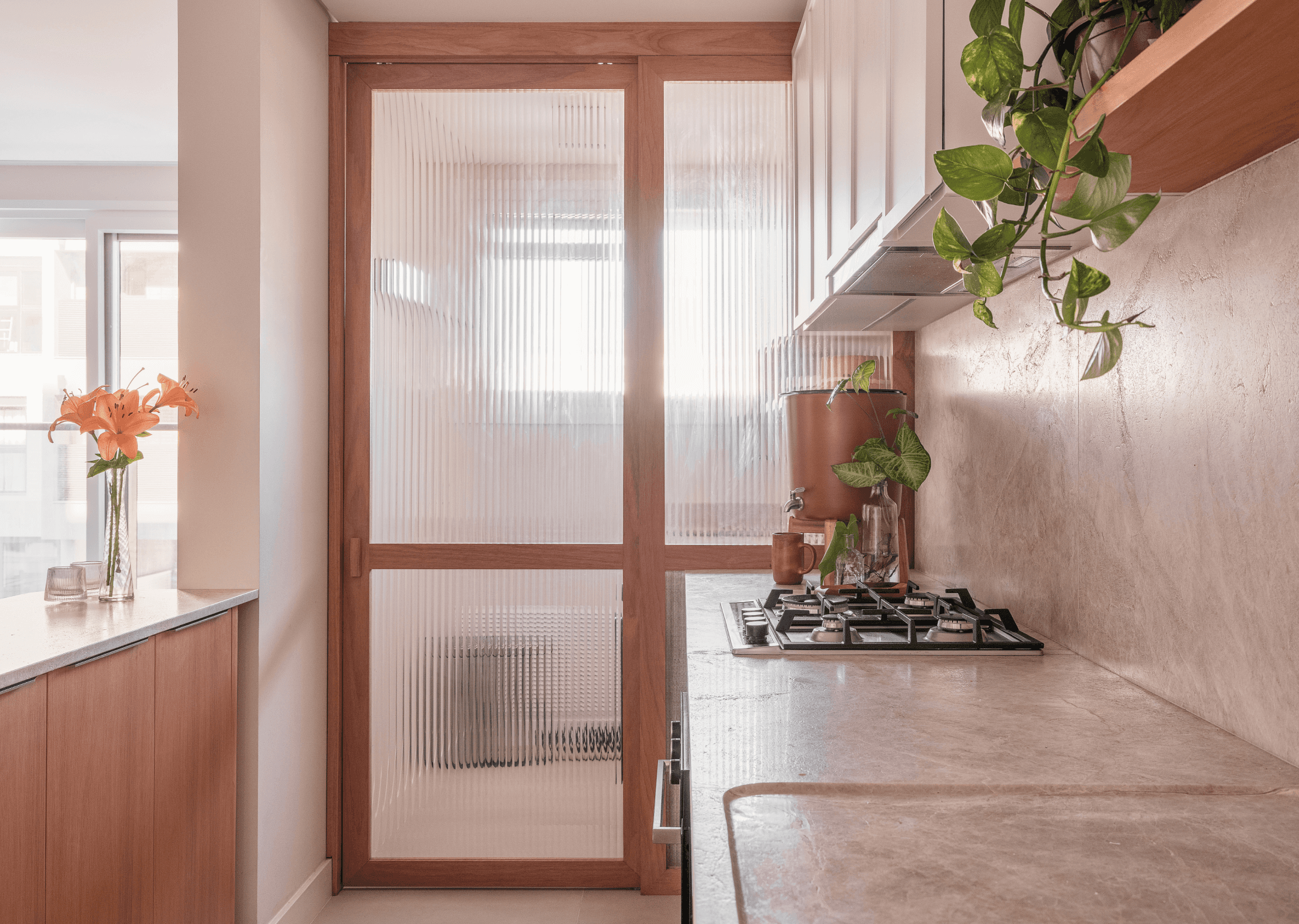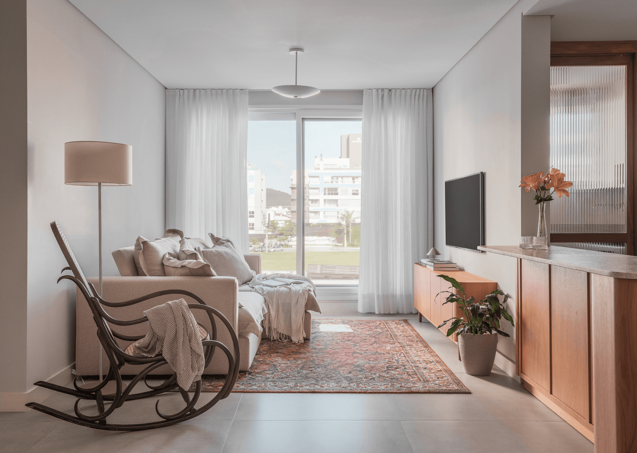 No apartamento do Lago, a atmosfera aconchegante é resultado da composição equilibrada entre materiais naturais e texturas atemporais. Madeira, pedra natural, palha indiana e vidro canelado dialogam de forma complementar, criando um cenário que responde ao desejo da cliente por um ambiente que unisse rusticidade, delicadeza e conforto.