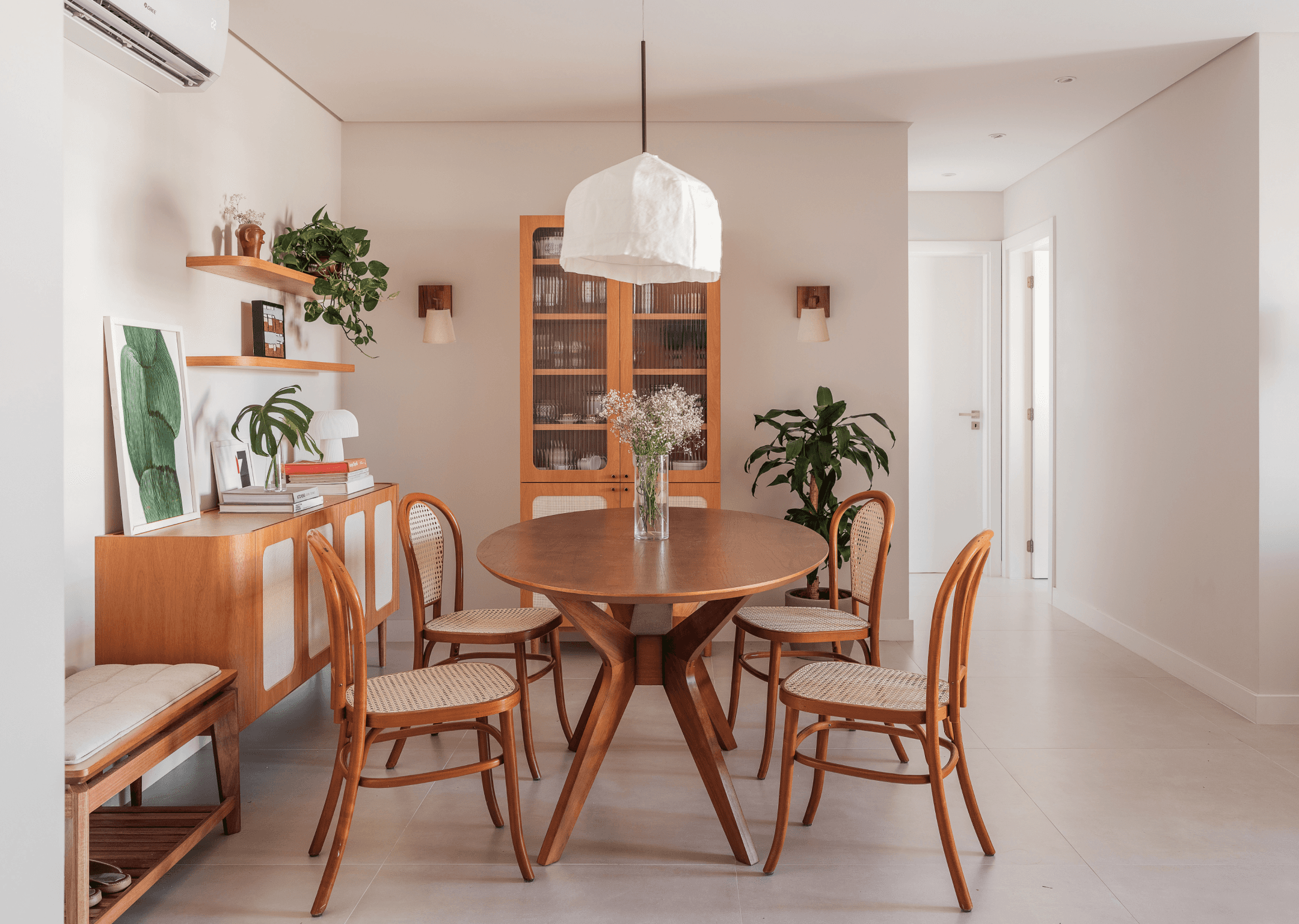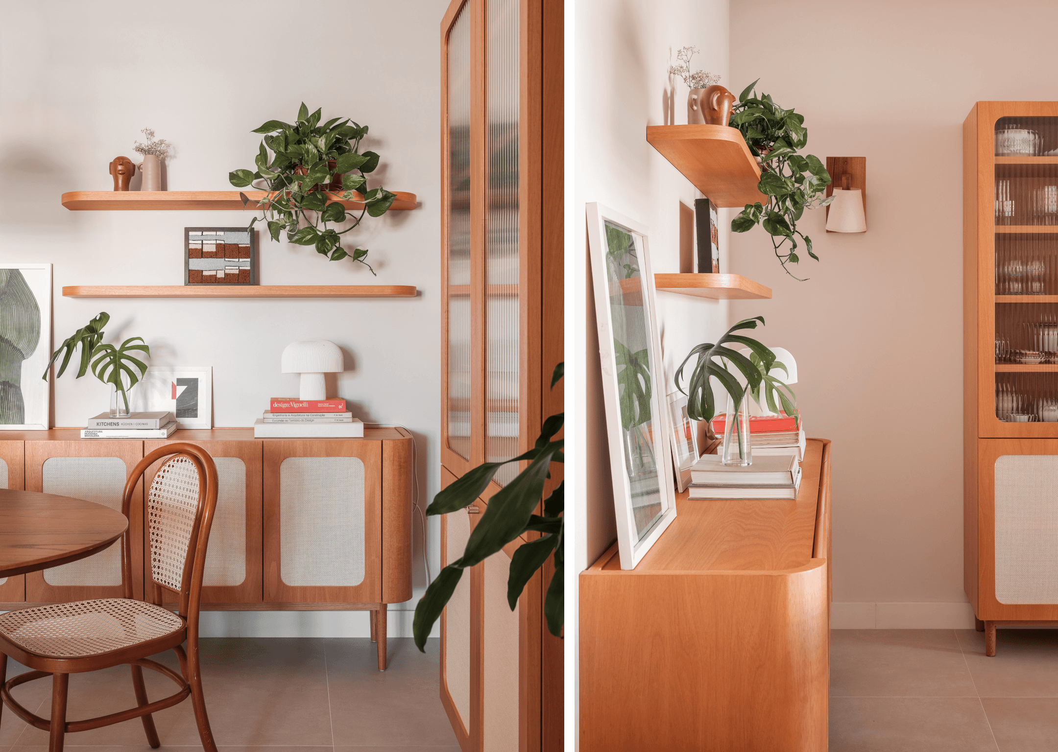 Já a marcenaria sob medida e os móveis soltos desenhados pelo Acá — como o buffet e a cristaleira de linhas curvas — reforçam essa suavidade.